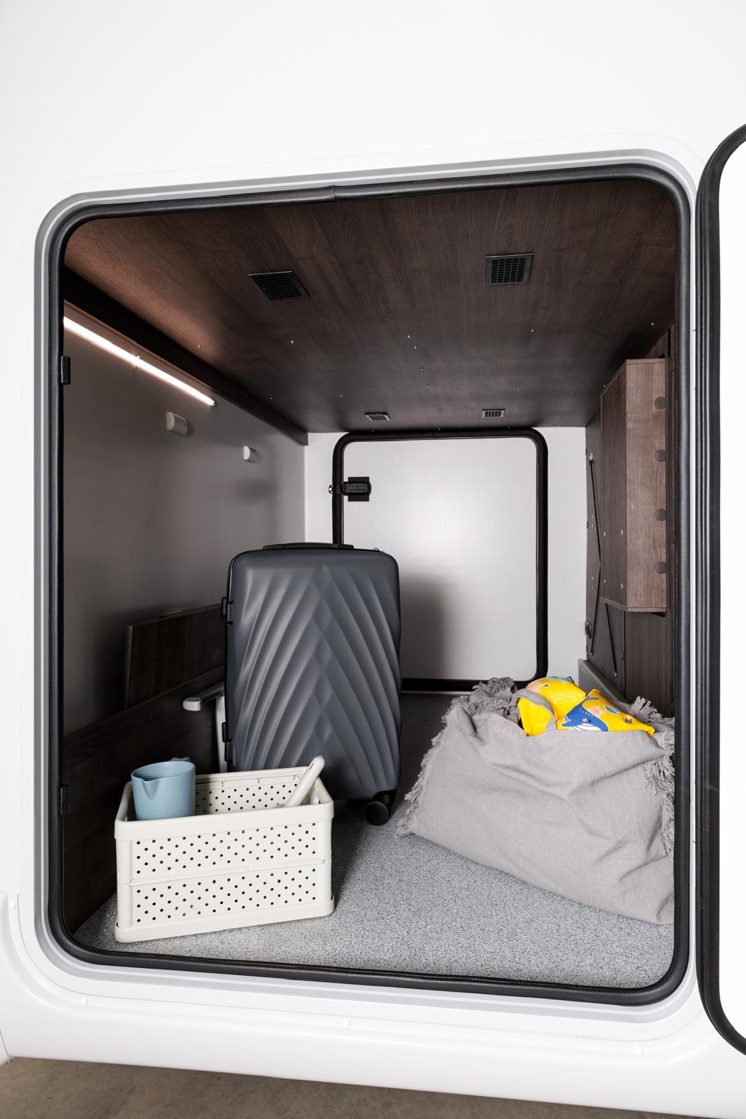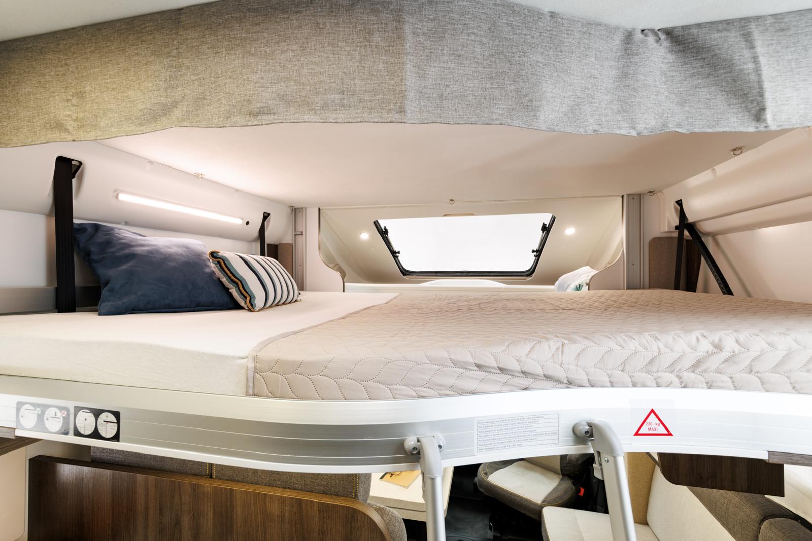 Para dormir dispone de camas gemelas transformables en una gran cama doble de 170×210 cm situadas en la parte trasera; y una cama suspendida de techo eléctrica de 2 plazas (máx. 230 kg) perfecta incluso para 2 adultos.
